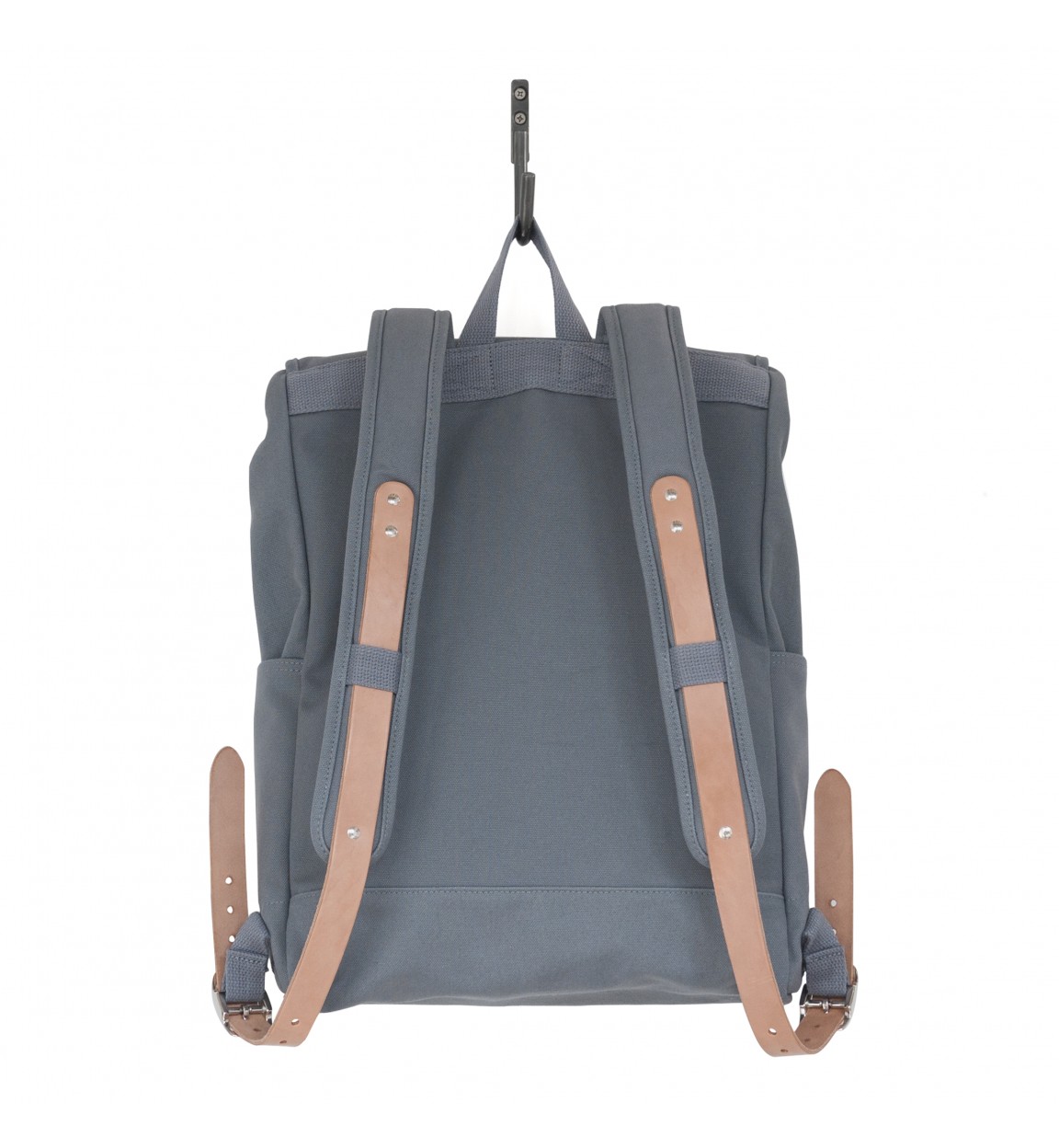 One main compartment with interior pocket. Two exterior side pockets. Padded shoulder straps. Nickel-plated hardware. Heavy Cotton Duck with webbing